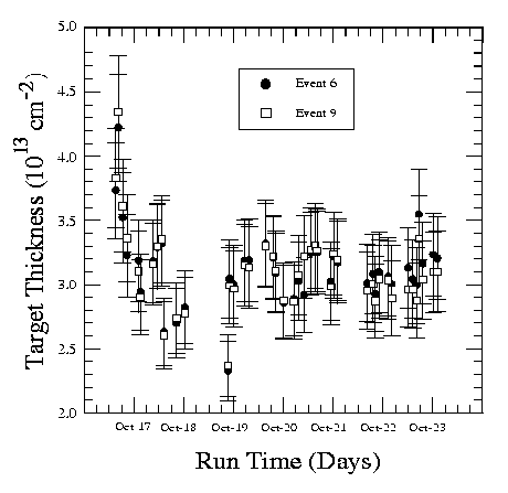 the run period the target thickness averaged 3.1E13 atoms per square