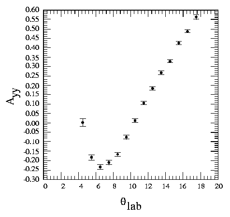 The plot shows our measured values for spin correlation coefficent Ayy in pp elastic scattering at 197 MeV.