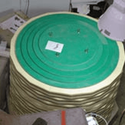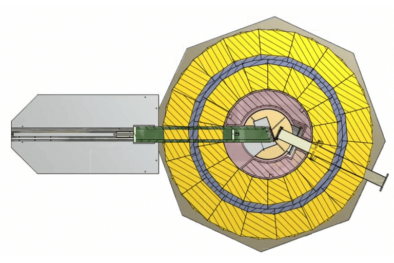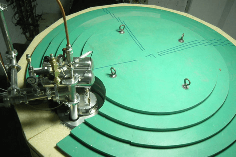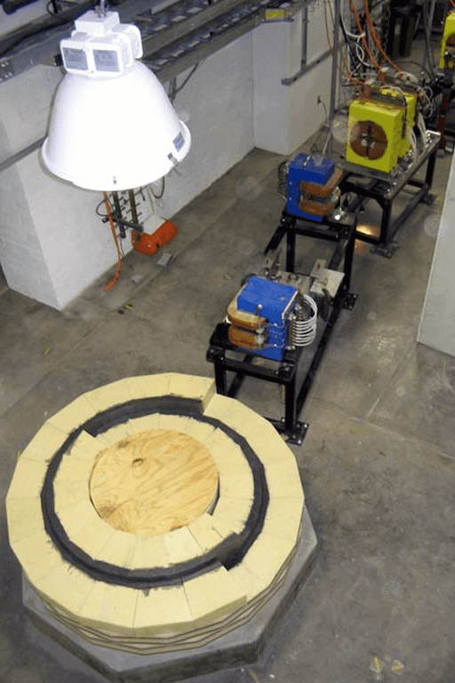 The completed TMR assembly. The green circular layers on top are sheets of borated polyethylene. The PVC pipe on the left is the temporary neutron flight path leading to the SANS instrument.