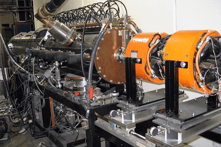 The PL-7, originally the injector for the CIS synchrotron ring, is moved into place. The PL-7 proton accelerator consists of two accelerating stages - a 3-MeV RFQ (radio frequency quadrupole) and a 4-MeV DTL (drift tube linac).