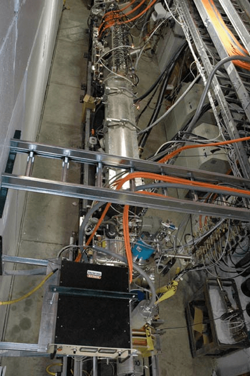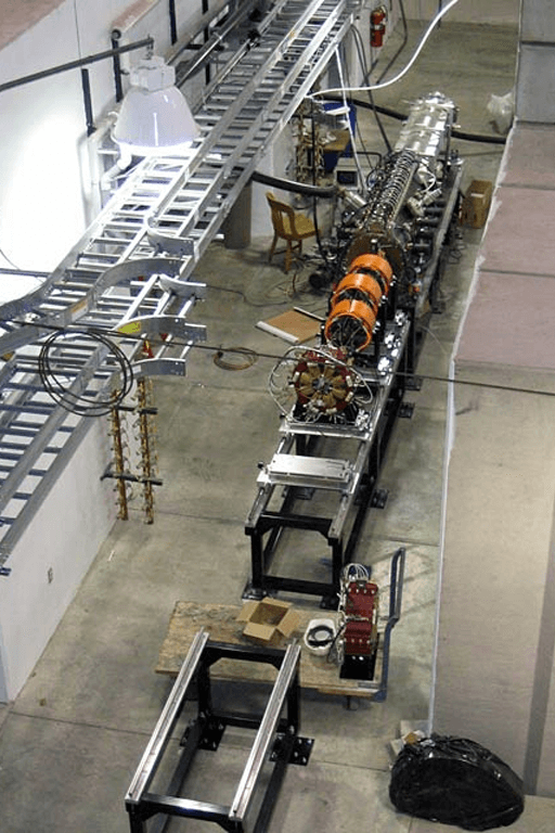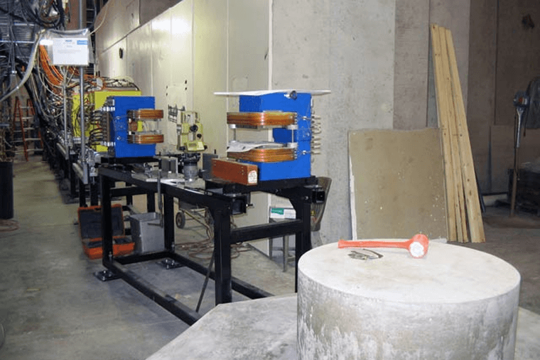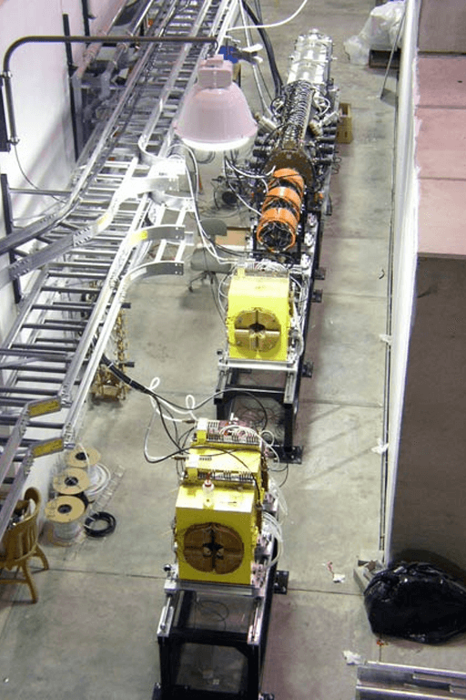Installation of the proton beamline begins. The orange components are quadrupole magnets used to focus the proton beam as it leaves the accelerator.