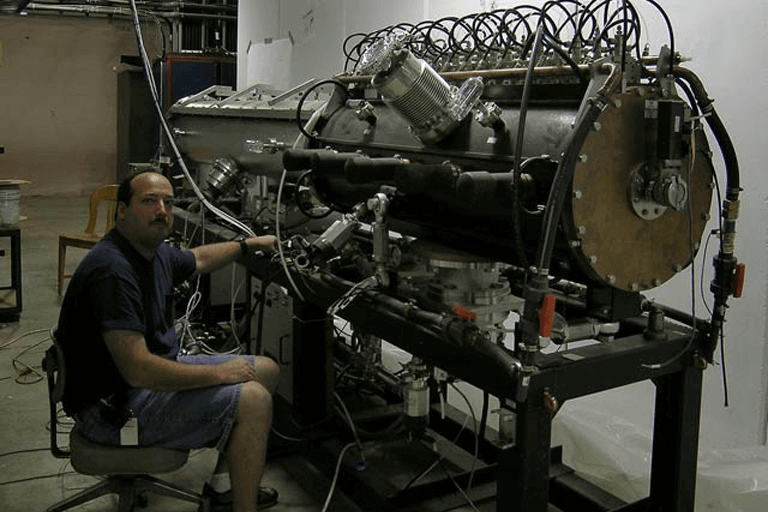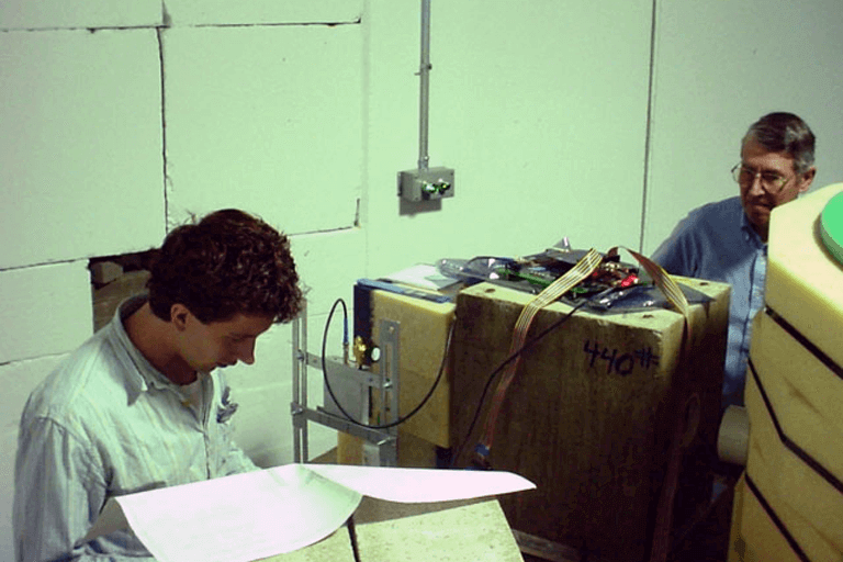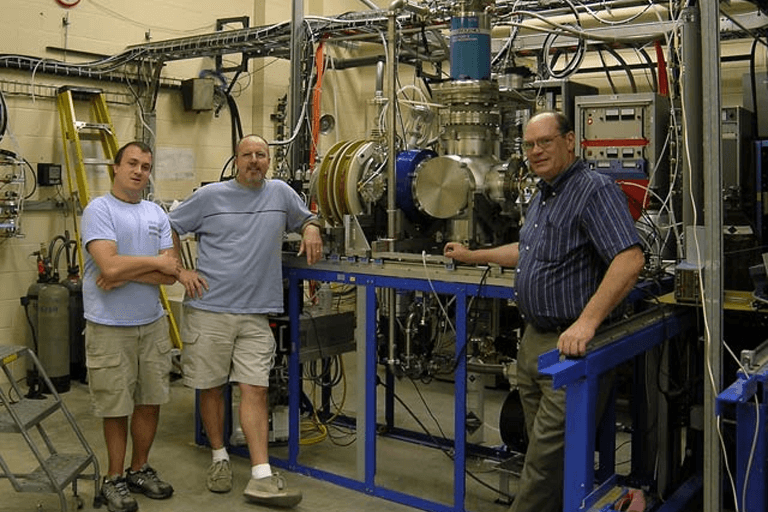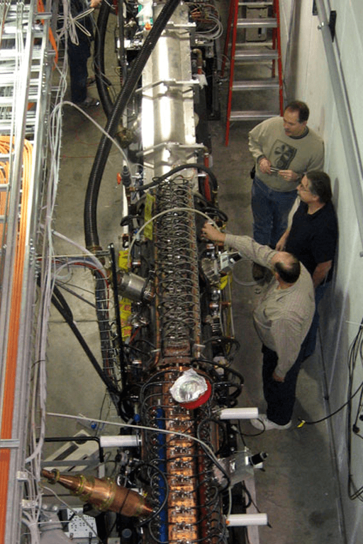 The injector for the LENS proton accelerator in the development area. Pictured from left to right (in the larger image) are Andy Sebold, Bob Brown, and Ron Kupper.