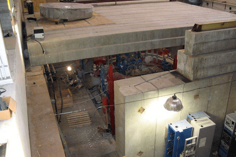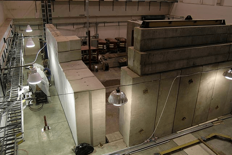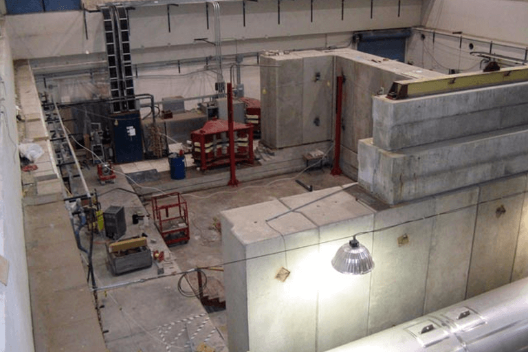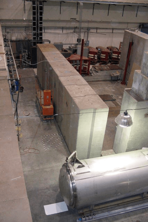 A view of the TMR vault. The finished pier for the TMR is shown on the left, and the support for the proton beamline is shown on the right. The door in the back leads through the maze to the LENS accelerator control area.