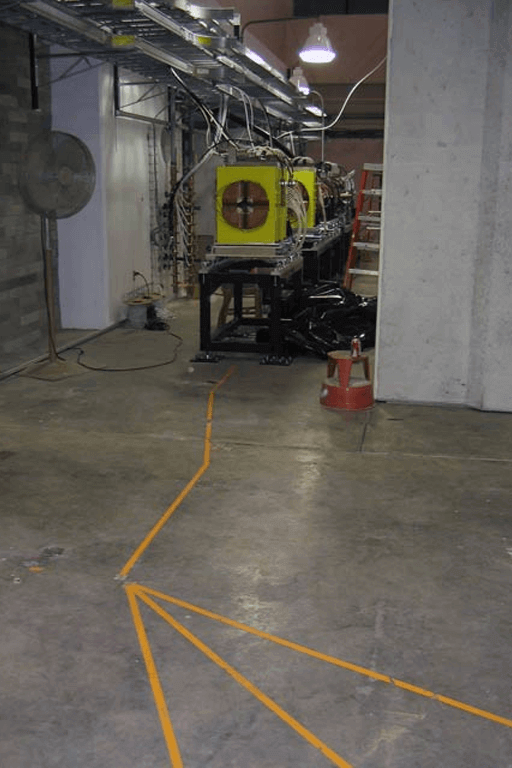 The LENS beamlines are surveyed in and their paths are marked on the floor with orange tape. The three paths in the foreground are the three LENS neutron flight paths. The point that they emanate from is where the moderator is located.