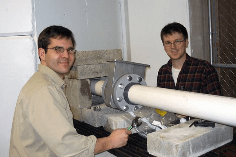 LENS graduate students Nick Remmes and Chris Lavelle make final adjustments to detectors on the SANS neutron flight path in preparation for the first neutron beam.