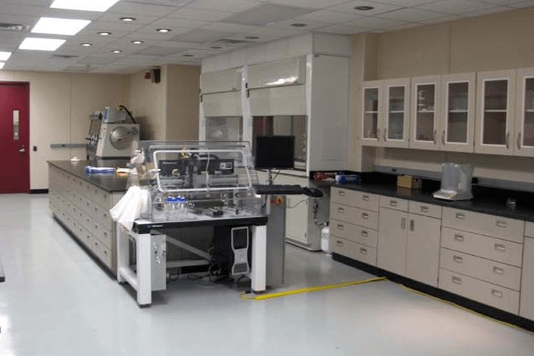 The Chemistry lab includes generous counter space, and standard instrument such as balances, pH meters, glassware etc.
