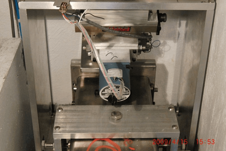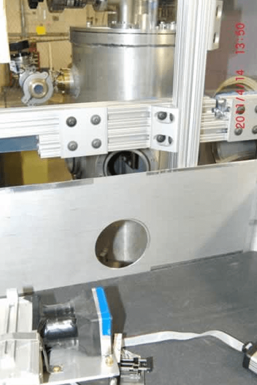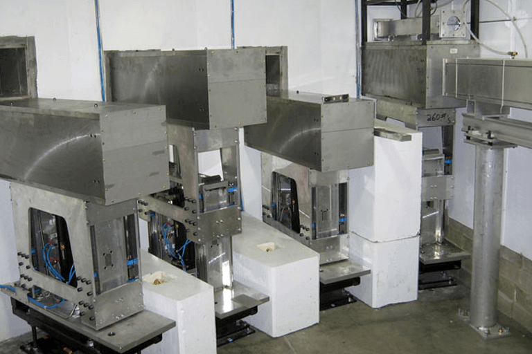 Four shutters installed in the new TMR vault. Shielding between the beam lines is not yet completely installed. The first two sections of the evacuated SANS beamline are visible (one on top of the (closed) shutter).