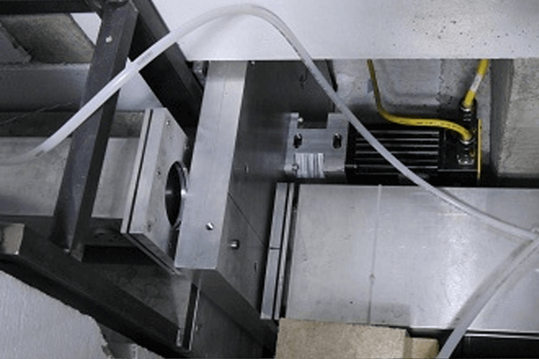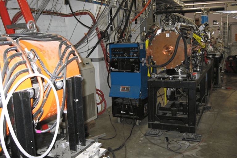 The final elements of the proton beamline are positioned. The blue components are dipole magnets used to steer the proton beam correctly onto the LENS neutron production target.