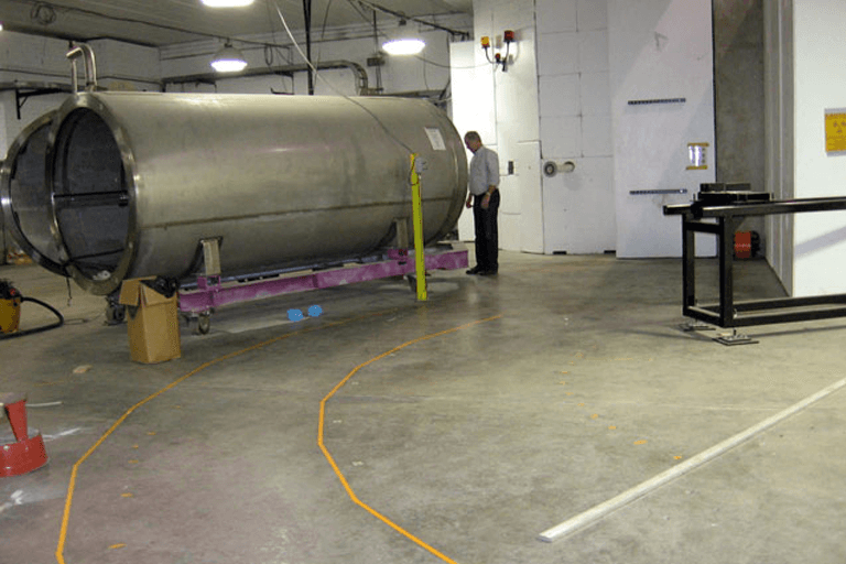 Reconfiguration of the first TMR vault for radiation effects research. Decommissioning of the prototype SANS and radiography instruments. The tape on the floor shows the future location of the main wall of the second TMR vault.