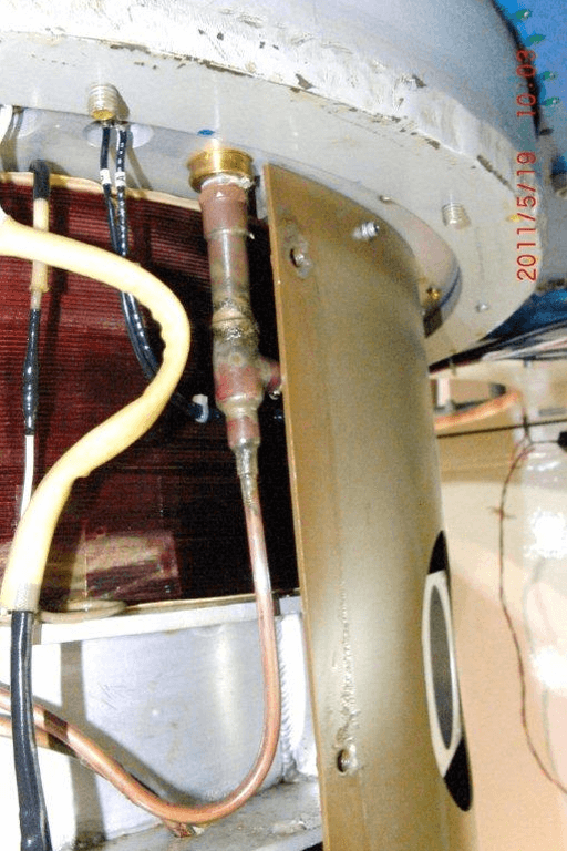 Klystron tube base develops a water leak inside the oil tank. the leak was fixed in place but required 2 weeks to recover the oil voltage holding capabilities.