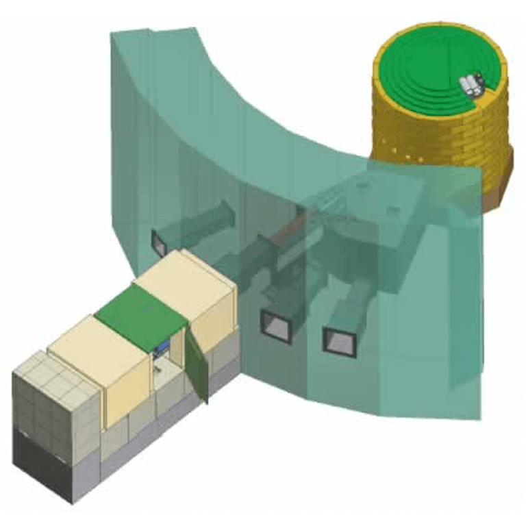 The final portion of the proton beamline and the reflector are installed. The beryllium neutron-production target is positioned within the reflector vessel. The reflector is filled with water are serves the purpose of “reflecting” stray neutrons back into the moderator. The moderator system is inserted into the rectangular cavity at the top of the reflector vessel. The shielding wall, half-stacked in the background, is to provide radiation isolation between the TMR vault and the proton accelerator vault.