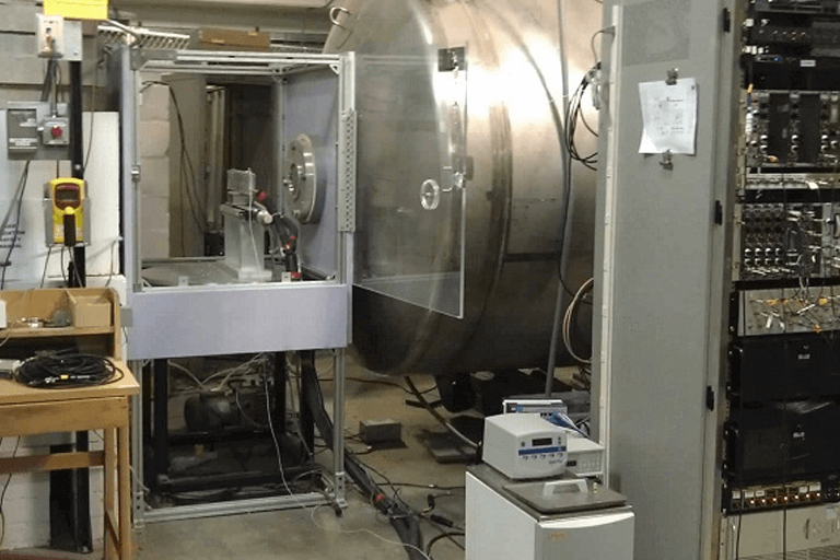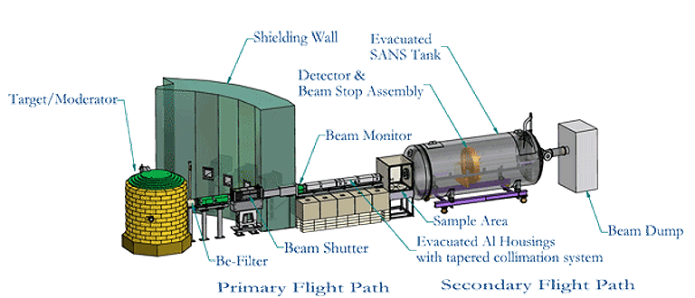 The NBL1-SANS instrument is the first of 4 neutron scattering instruments to be operational at LENS. It utilizes a pin-hole collimation and covers a Q-range of 0.008 – 0.5 Å-1 with a neutron flux of ~104 n/cm2/sec. This instrument allows one to probe scattering length density correlations over length scales from 20 -500Å. The instrument consists of 4 instrument sections (Primary Flight Path, Sample Area, Secondary Flight Path, and Beam Dump), where the vault wall constitutes the boundary between the TMR (Target Moderator Reflector) facility and the SANS Instrument. Figure 2 and 3 below show a layout and a picture of the SANS Instrument, respectively.