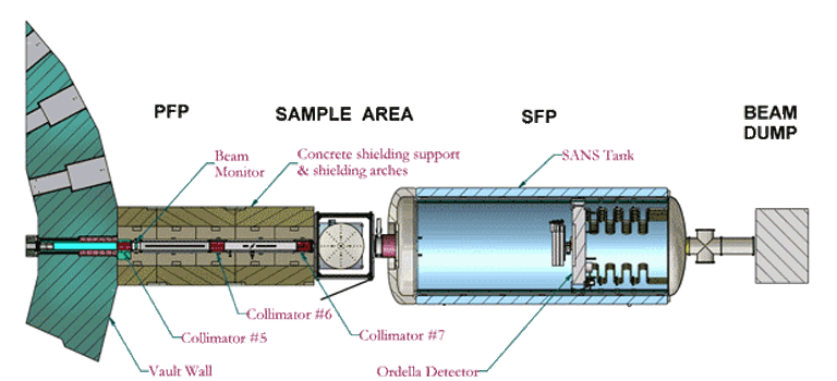 The Secondary Flight Path (SFP) incorporates the detection system for the scattered neutrons. It consists of an evacuated stainless steel tank (Si entrance window), the 2D detector (manufactured by ORDELA, model 2651N, serial# 002), and a beam stop assembly. The latter allows BN-beam stops of various sizes (3cm, 5cm, 8cm, and 10cm diameter, depending on sample-to-detector distance) to be driven into the incident beam in order to prevent damage of the area detector. The whole beam stop assembly can also be moved vertically for alignment purposes. The 2D-detector can be translated inside of the evacuated SANS tank, in order to change sample-to-detector distance, i.e. Q-range and Q-resolution. At the door in the back of the SANS tank, a 12” diameter ISO cross with a 20” long extension piece is attached and also evacuated. The Beam Dump (BD) functions as the beam stop for higher energy neutrons transmitted through the 2D detector and exiting the SFP.